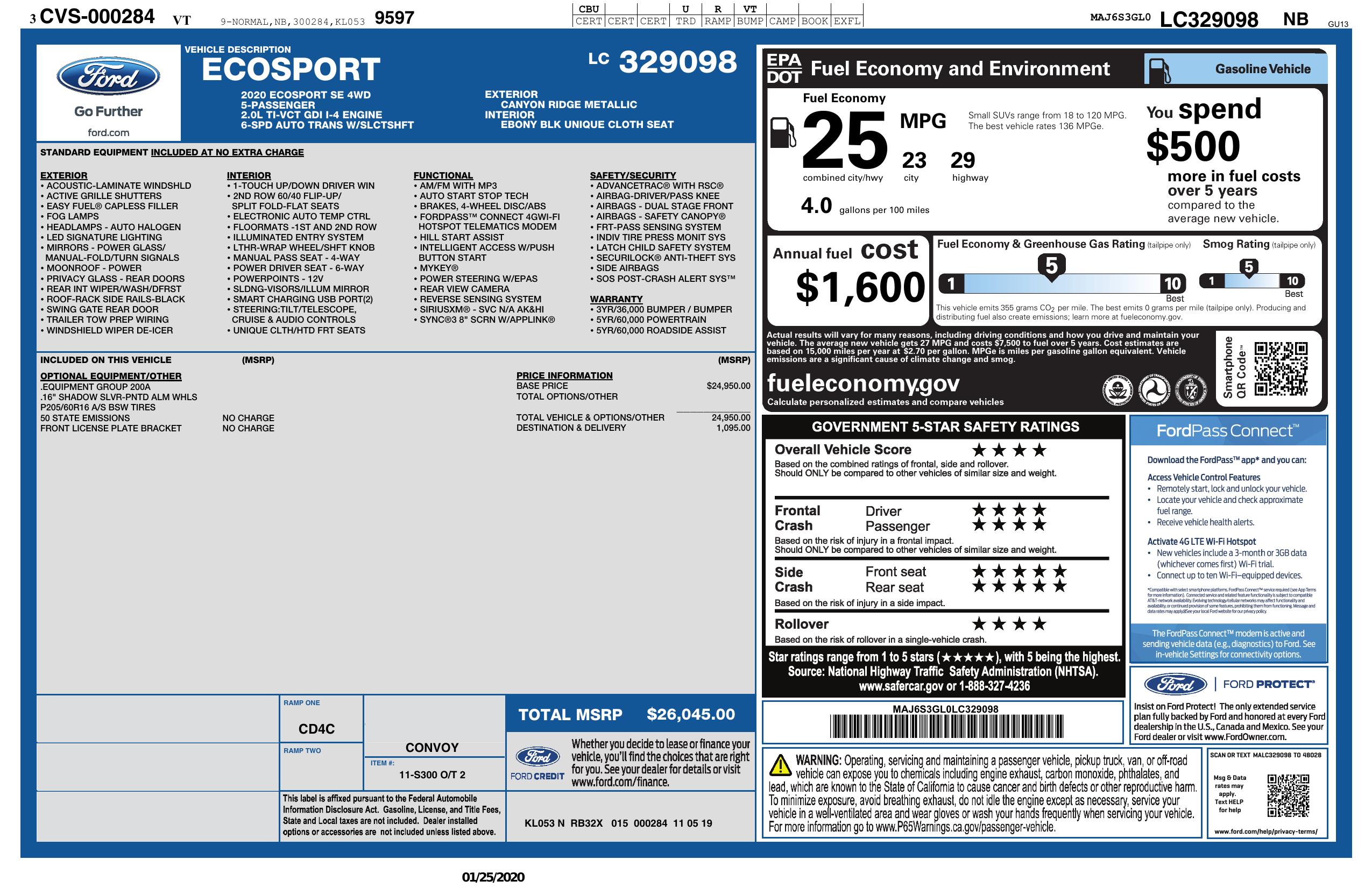 City 23/Hwy 29 Estimated By E.P.A. - Actual Mileage May Vary